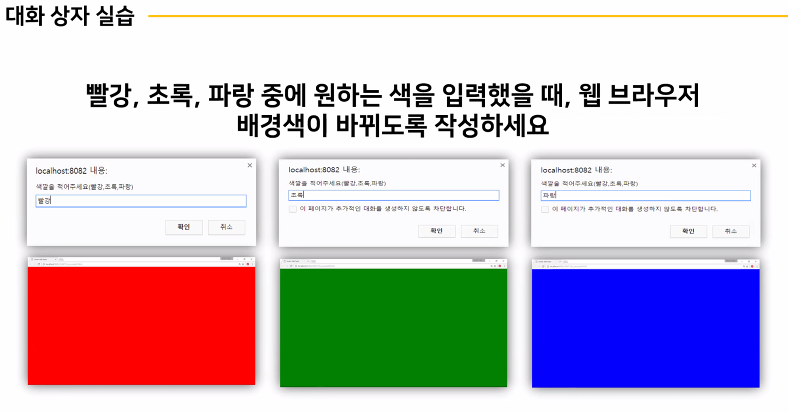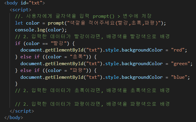 prompt 사용 ====> prompt("색깔을 적어주세요") 그리고 변수값에 담아준다