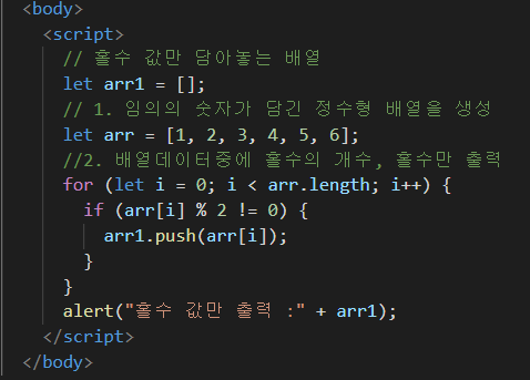 배열을 이용하여 배열안에 존재하는 홀수값만 따로 가져와서 알람으로 출력하기