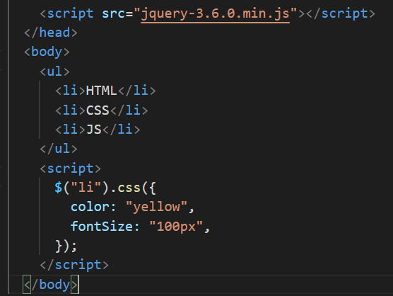 color: "yellow"---> li태그 3개다 옐로우 출력 / fontSize : "100px" ---> li태그 3개다 글씨크기 100픽셀